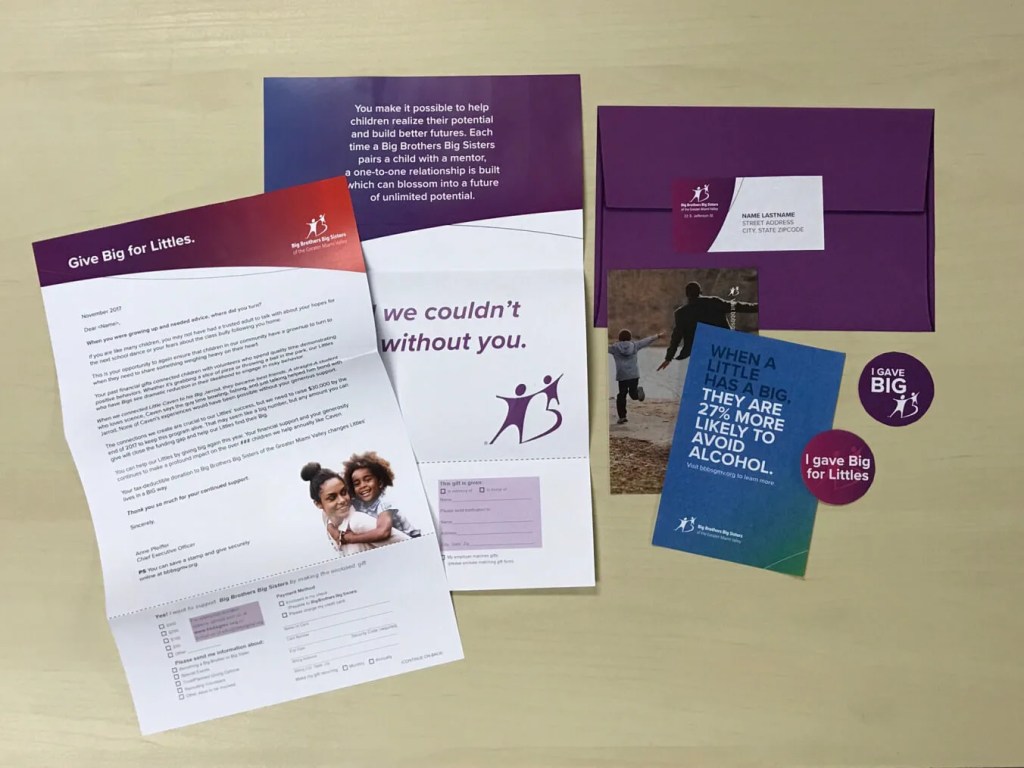 To meet this challenge, Hannah Krafka and Nova Creative worked closely with BBBSGMV to understand their needs and goals. They created a compelling two-sided letter that was delivered in a branded envelope. Additionally, stickers and statistical note cards were included to help make a lasting impact on donors.