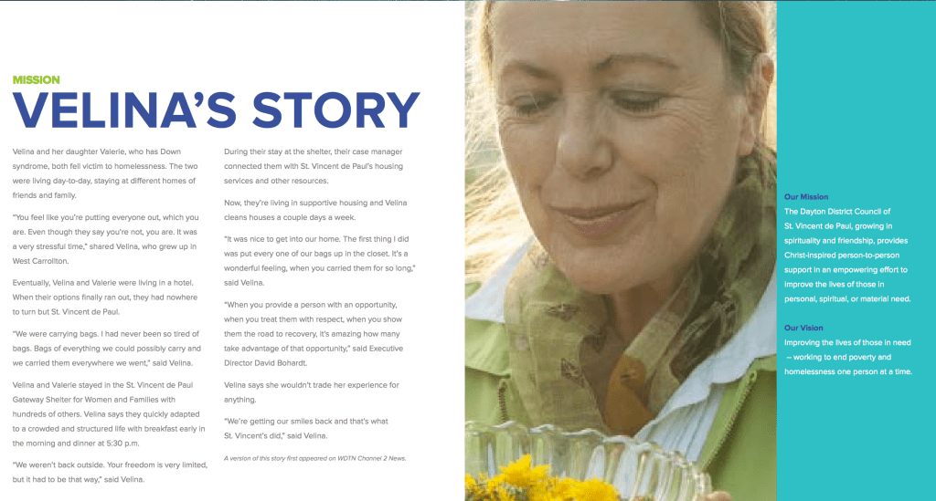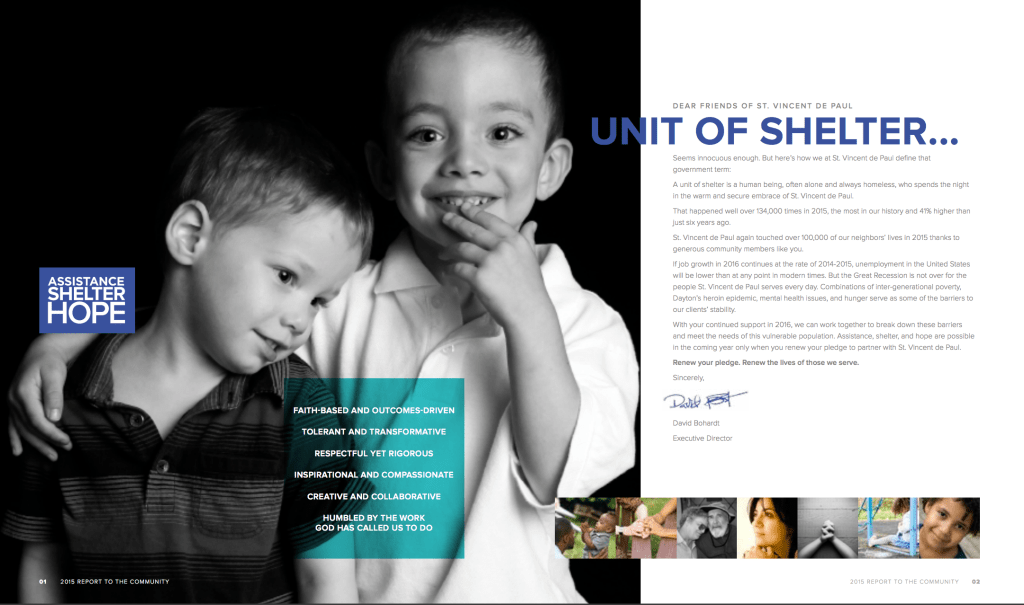 To revamp the branding, website, newsletter, and annual report for St. Vincent de Paul, a non-profit organization dedicated to serving those in need in the Dayton community.